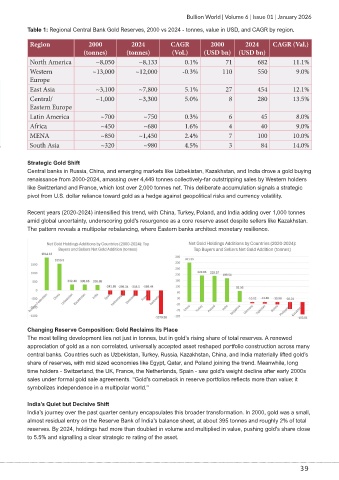 Table 1: Regional Central Bank Gold Reserves, 2000 vs 2024 - tonnes, value in USD, and CAGR by region.